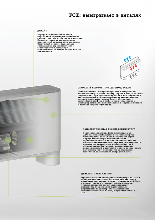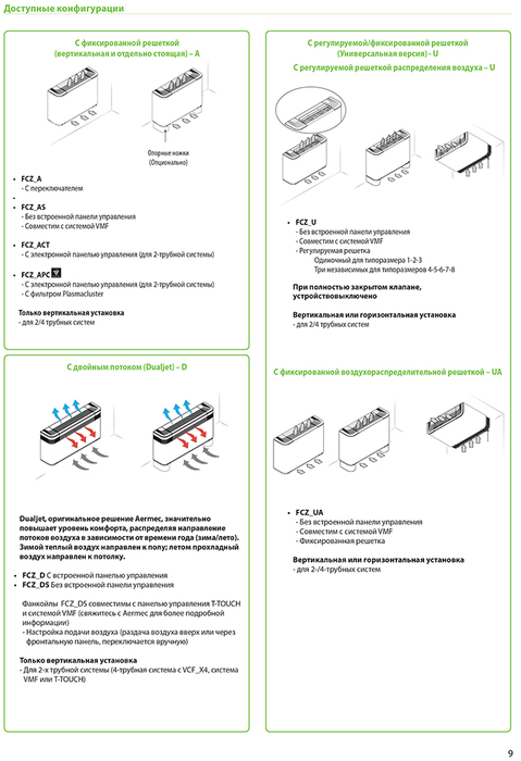 Линейка FCZ — это современные фанкойлы универсальной установки, разработанные компанией Aermec. Серия весьма разнообразна и включает модификации для монтажа в вертикальном или горизонтальном положении, оснащенные панелями управления, а также без них. Семейство также имеет модели с исполнением Dualjet — с двойным воздушным потоком.