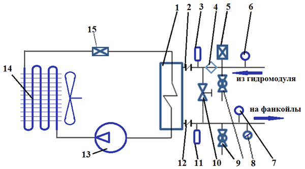 Ниже представлена схема обвязки чиллера, где гидромодуль расположен после фанкойла, но перед испарителем чиллера. Такое расположение считается наиболее удобным и предпочтительным. Расположение чиллера само по себе не влияет на схему подключения, но самым популярным принципом организации холодильного контура является чиллер с воздушным конденсатором. Ниже представлена схема подключения такого чиллера. В максимальной комплектации, подключение чиллера включает позиции 2-12. Позиции 1, 13, 14, 15 составляют сам чиллер.